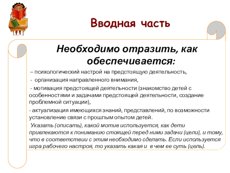 Указать (описать), какой мотив используется, как дети привлекаются к пониманию стоящей перед ними задачи (цели), и тому, что в соответствии с этим необходимо сделать. Если используется игра рабочего настроя, то указать какая и в чем ее суть (цель).