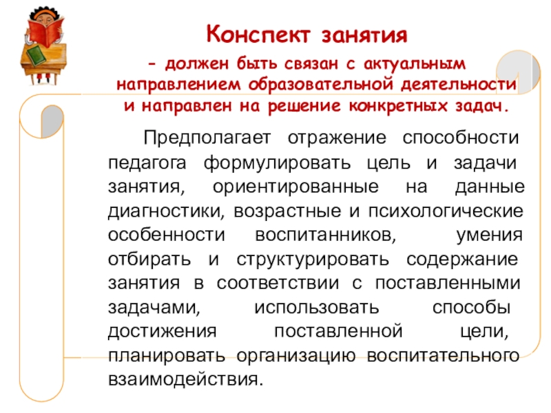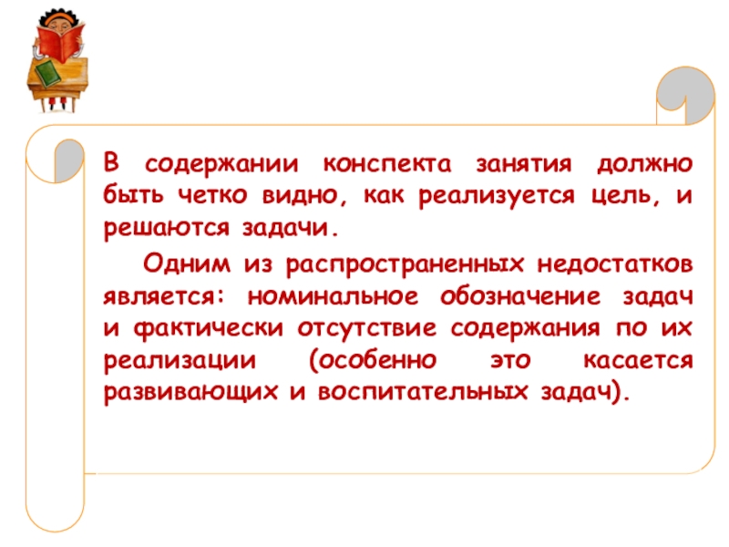 В содержании конспекта занятия должно быть четко видно, как реализуется цель,