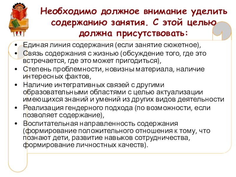 Слайд 8Необходимо должное внимание уделить содержанию занятия. С этой целью должна присутствовать: