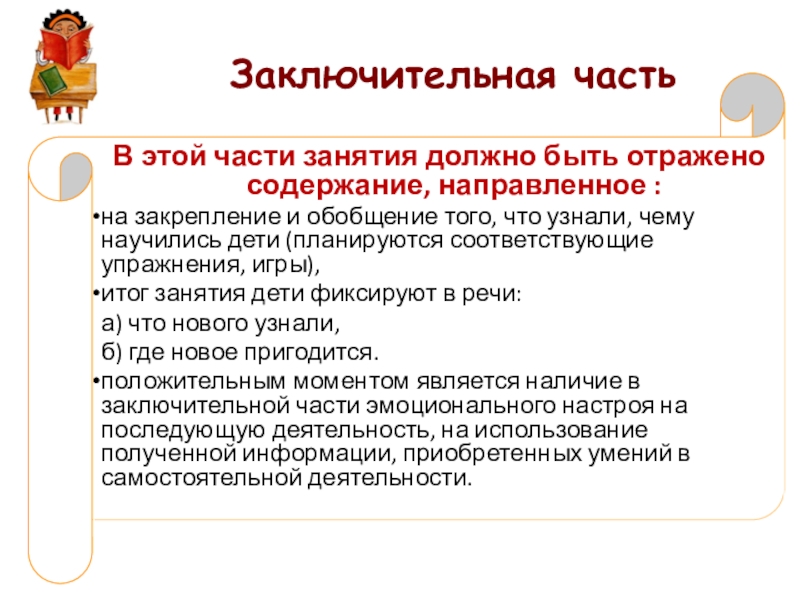 положительным моментом является наличие в заключительной части эмоционального настроя на последующую деятельность, на использование полученной информации, приобретенных умений в самостоятельной деятельности.
