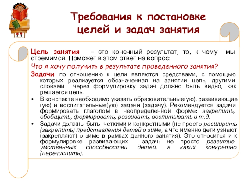 Задачи должны быть четкими и конкретными (не просто расширить (закрепить) представления детей о зиме, а что именно дети узнают (закрепляют) о зиме в рамках данного занятия). Это относится и к формулировке развивающих задач: не просто развитие умственных способностей детей, а каких конкретно (перечислить).