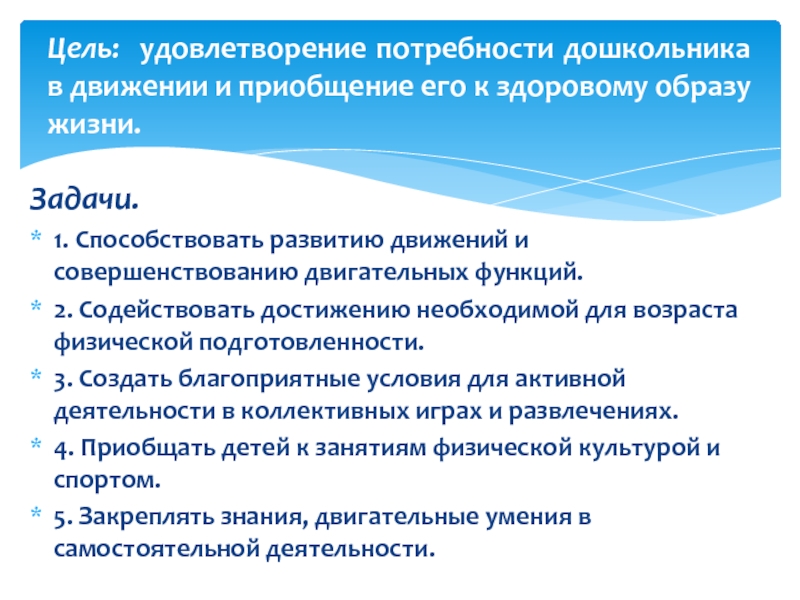 Цель: удовлетворение потребности дошкольника в движении и приобщение его к здоровому образу жизни.