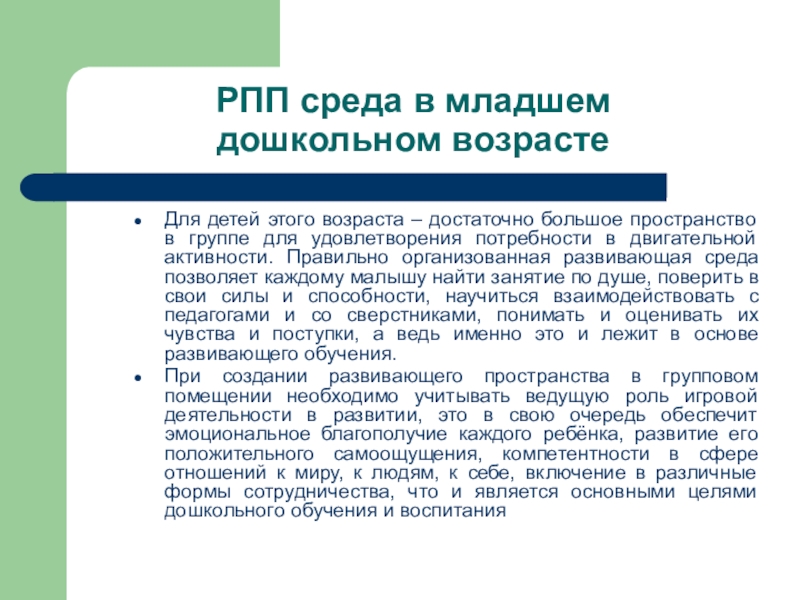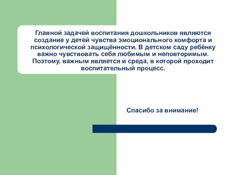 и психологической защищённости. В детском саду ребёнку важно чувствовать себя любимым и неповторимым. Поэтому, важным является и среда, в которой проходит воспитательный процесс.