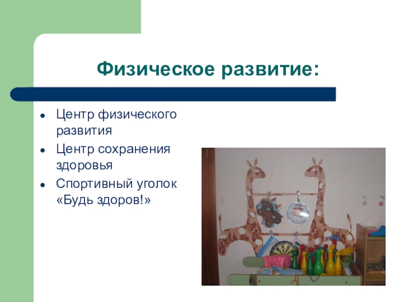 большое пространство в группе для удовлетворения потребности в двигательной активности. Правильно организованная развивающая среда позволяет каждому малышу найти занятие по душе, поверить в свои силы и способности, научиться взаимодействовать с педагогами и со сверстниками, понимать и оценивать их чувства и поступки, а ведь именно это и лежит в основе развивающего обучения.