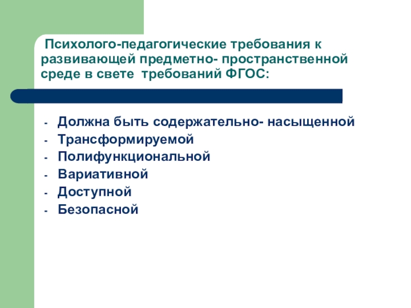 Слайд 8 Психолого-педагогические требования к развивающей предметно- пространственной среде в свете требований