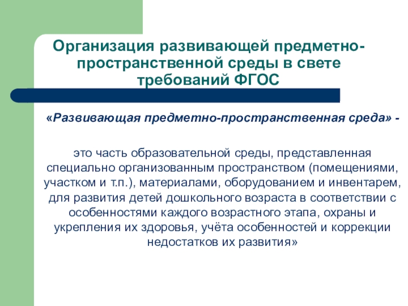 это часть образовательной среды, представленная специально организованным пространством (помещениями, участком и т.п.), материалами, оборудованием и инвентарем, для развития детей дошкольного возраста в соответствии с особенностями каждого возрастного этапа, охраны и укрепления их здоровья, учёта особенностей и коррекции недостатков их развития»
