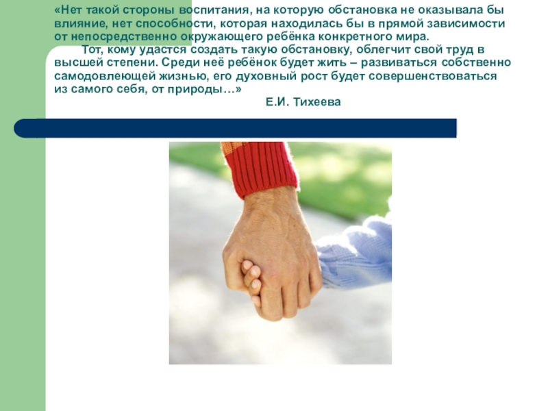 Тот, кому удастся создать такую обстановку, облегчит свой труд в высшей степени. Среди неё ребёнок будет жить – развиваться собственно самодовлеющей жизнью, его духовный рост будет совершенствоваться из самого себя, от природы…»