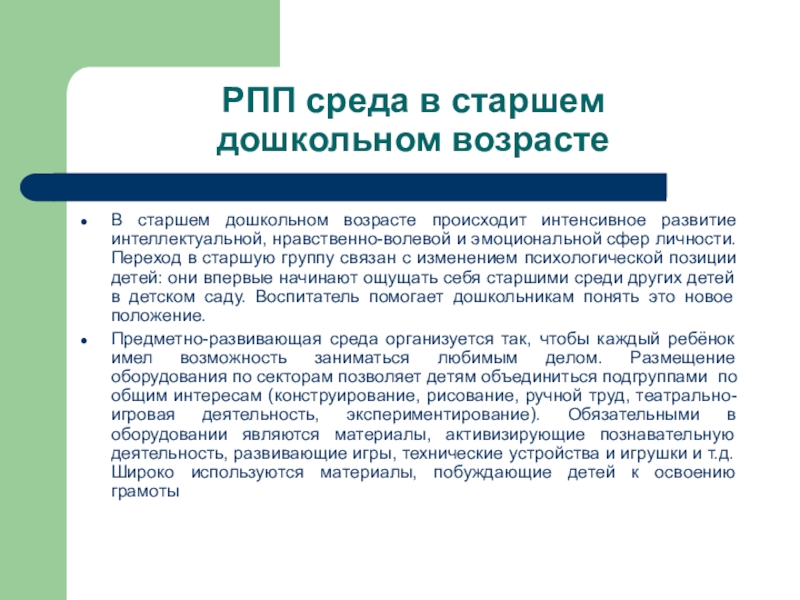 развитие интеллектуальной, нравственно-волевой и эмоциональной сфер личности. Переход в старшую группу связан с изменением психологической позиции детей: они впервые начинают ощущать себя старшими среди других детей в детском саду. Воспитатель помогает дошкольникам понять это новое положение.