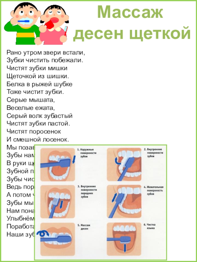 Зубы нужно чистить не менее 3х минут. Передние зубы чистить по направлению вверх и вниз, затем задние зубы. Зубы всегда нужно чистить круговыми движениями
