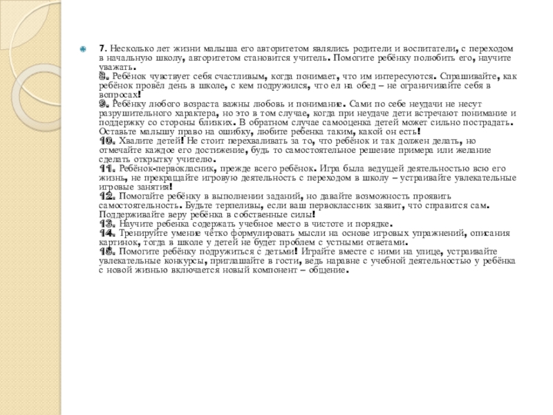 11. Ребёнок-первокласник, прежде всего ребёнок. Игра была ведущей деятельностью всю его жизнь, не прекращайте игровую деятельность с переходом в школу – устраивайте увлекательные игровые занятия!