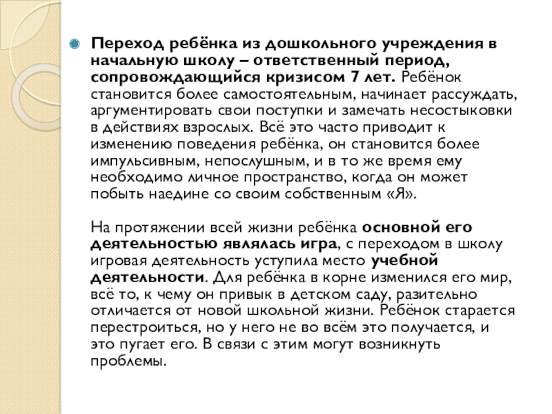 Слайд 2Переход ребёнка из дошкольного учреждения в начальную школу – ответственный период,