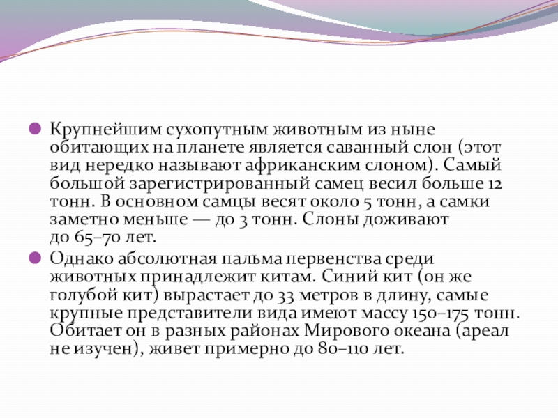 Крупнейшим сухопутным животным из ныне обитающих на планете является саванный слон (этот вид