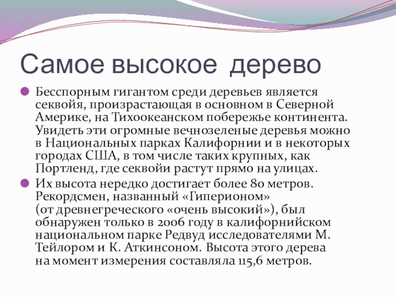 Их высота нередко достигает более 80 метров. Рекордсмен, названный «Гиперионом» (от древнегреческого «очень высокий»), был обнаружен только в 2006 году в калифорнийском национальном парке Редвуд исследователями М. Тейлором и К. Аткинсоном. Высота этого дерева на момент измерения составляла 115,6 метров.