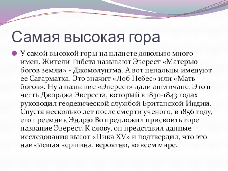 Жители Тибета называют Эверест «Матерью богов земли» - Джомолунгма. А вот непальцы именуют ее Сагарматха. Это значит «Лоб Небес» или «Мать богов». Ну а название «Эверест» дали англичане. Это в честь Джорджа Эвереста, который в 1830-1843 годах руководил геодезической службой Британской Индии. Спустя несколько лет после смерти ученого, в 1856 году, его преемник Эндрю Во предложил присвоить горе название Эверест. К слову, он представил данные исследования высот «Пика XV» и подтвердил, что это наивысшая вершина, вероятно, во всем мире.