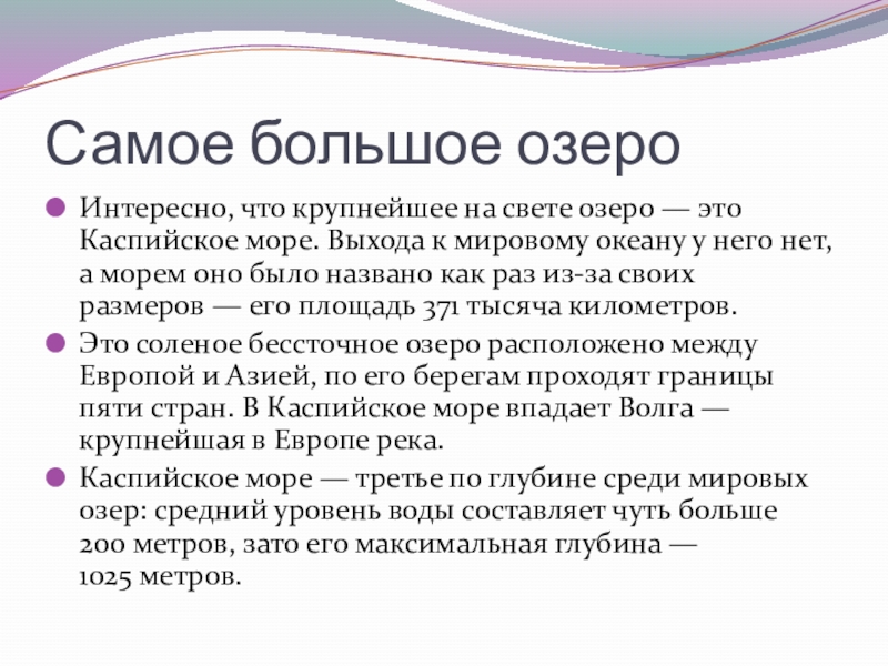 Интересно, что крупнейшее на свете озеро — это Каспийское море.