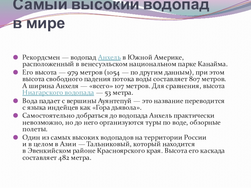 Рекордсмен — водопад Анхель в Южной Америке, расположенный в венесуэльском национальном