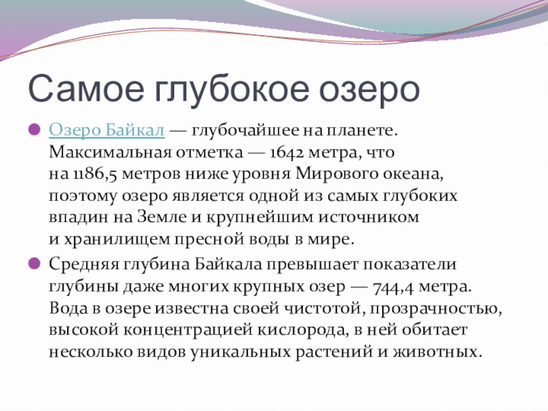 Озеро Байкал — глубочайшее на планете. Максимальная отметка — 1642 метра, что