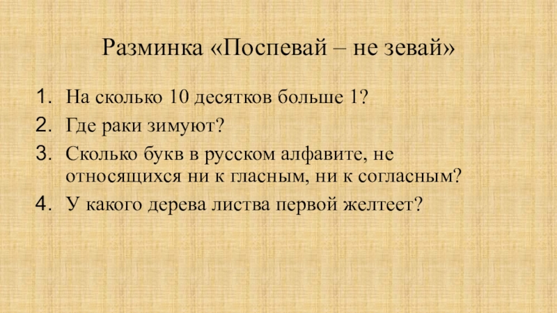 Разминка «Поспевай – не зевай»На сколько 10 десятков больше 1?Где раки зимуют?Сколько букв в русском алфавите, не относящихся ни к гласным, ни к согласным?У какого дерева листва первой желтеет?