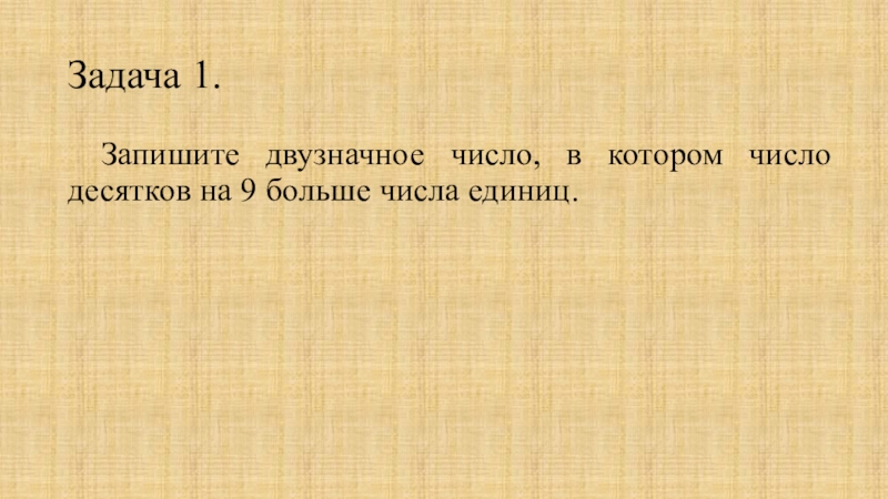 Задача 1.	Запишите двузначное число, в котором число десятков на 9 больше числа единиц.