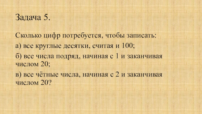 Задача 5.Сколько цифр потребуется, чтобы записать:а) все круглые десятки, считая и 100;б) все числа подряд, начиная с