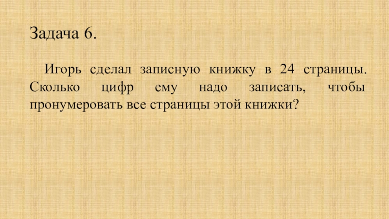 Задача 6.	Игорь сделал записную книжку в 24 страницы. Сколько цифр ему надо записать, чтобы пронумеровать все страницы