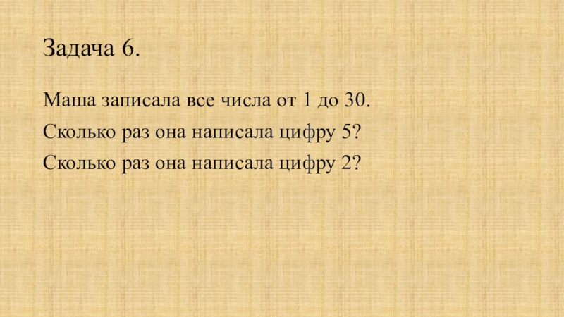 Задача 6.Маша записала все числа от 1 до 30.Сколько раз она написала цифру 5?Сколько раз она написала