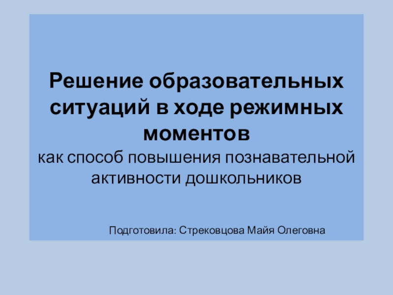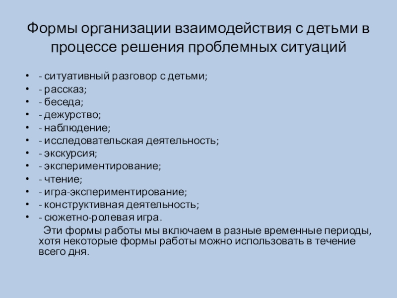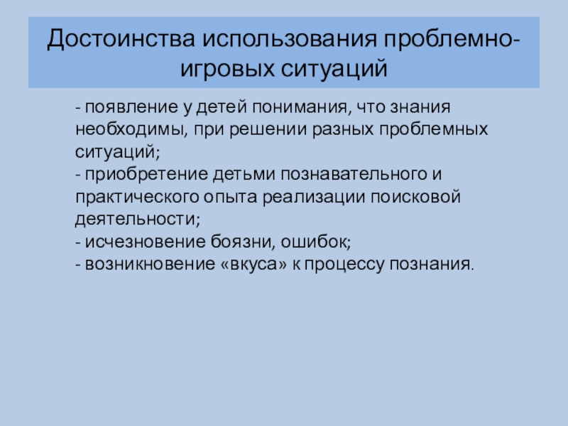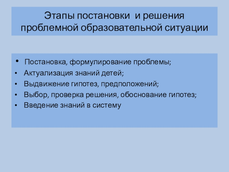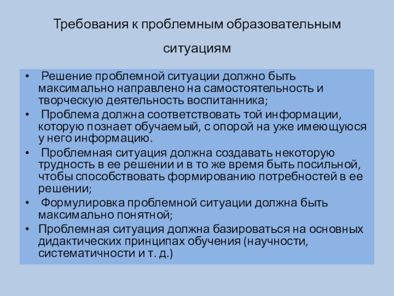 Основная цель создания проблемных ситуаций заключается в осознании и разрешении этих ситуаций в ходе совместной деятельности педагога и детей, при оптимальной самостоятельности дошкольников и под общим направляющим руководством воспитателя.
