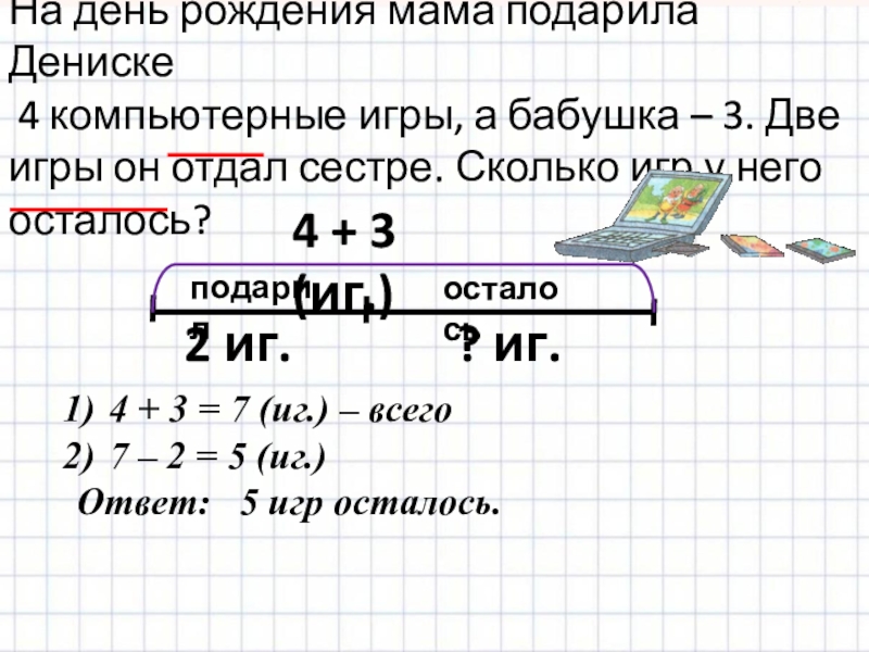 У Вани было 2 тетради в клетку и 8 в линейку. Пять тетрадей он израсходовал. Сколько тетрадей у него осталось?