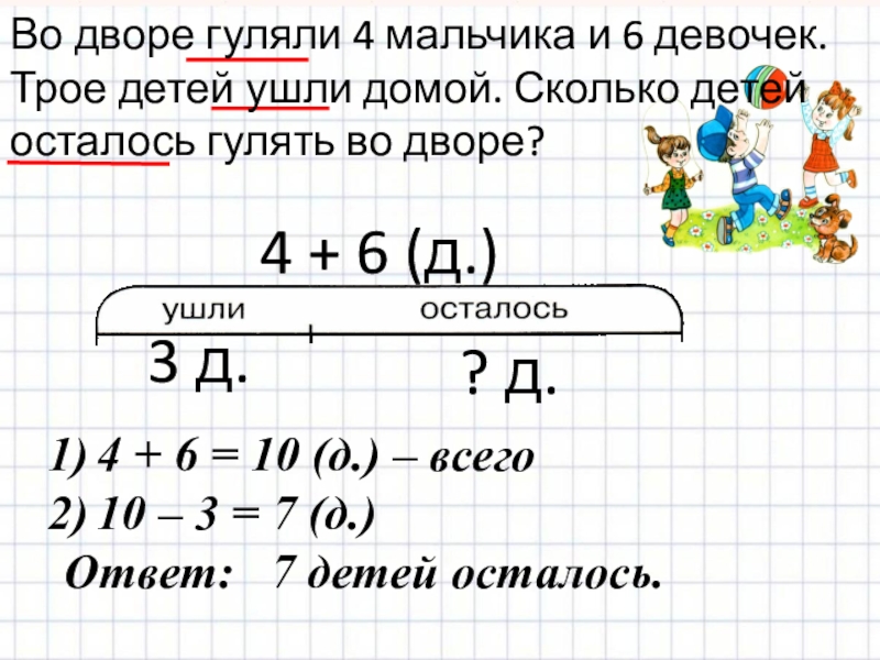 Во дворе гуляли 4 мальчика и 6 девочек. Трое детей ушли домой. Сколько детей осталось гулять во дворе?