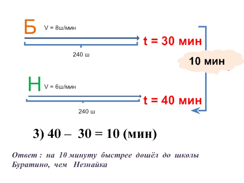 Ответ : на 10 минуту быстрее дошёл до школы Буратино, чем Незнайка