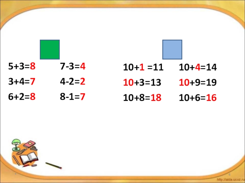5+3=8 7-3=43+4=7 4-2=26+2=8 8-1=710+1 =11 10+4=1410+3=13 10+9=19 10+8=18 10+6=16*