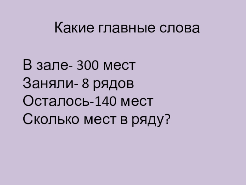 В зале- 300 мест Заняли- 8 рядов Осталось-140 мест Сколько мест в ряду?Какие главные слова