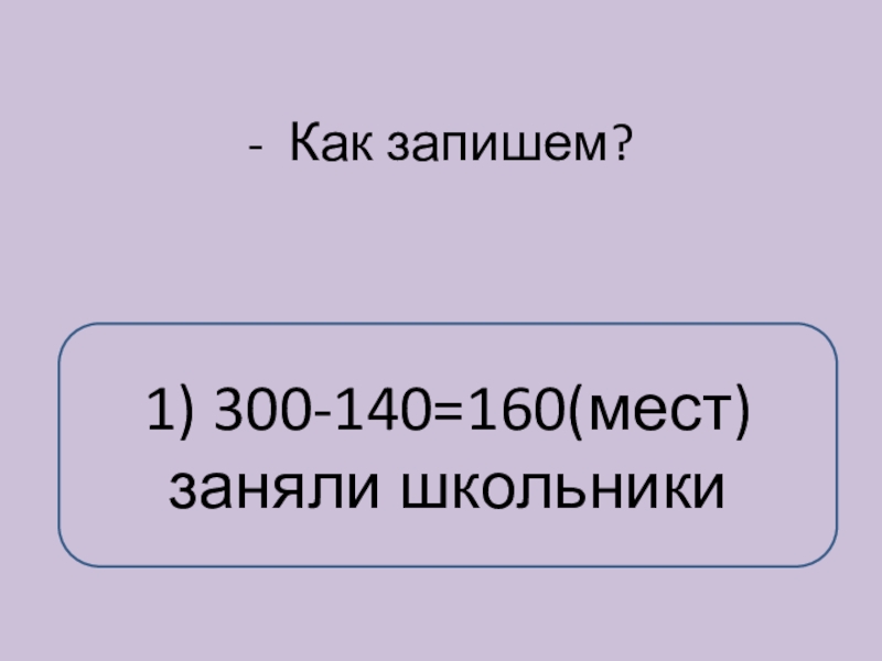 - Как запишем?1) 300-140=160(мест) заняли школьники
