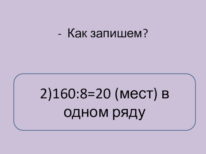 - Как запишем?2)160:8=20 (мест) в одном ряду