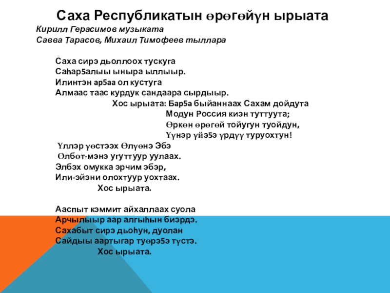 Государственный гимн Республики Саха (Якутия)Музыка Кирилла ГерасимоваСлова Саввы Тарасова, Михаила ТимофееваПеревод Владимира ФёдороваЯкутия, ты светом зариК добру