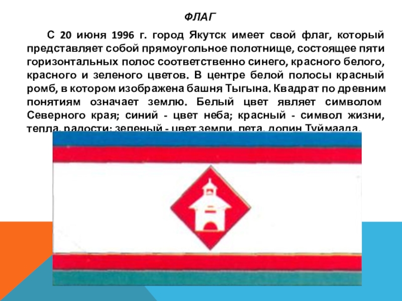 ФЛАГ    С 20 июня 1996 г. город Якутск имеет свой флаг, который представляет собой