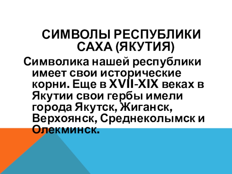 СИМВОЛЫ РЕСПУБЛИКИ САХА (ЯКУТИЯ)Символика нашей республики имеет свои исторические корни. Еще в XVII-XIX веках в Якутии свои