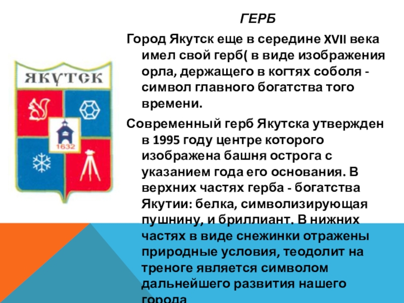 ГЕРБГород Якутск еще в середине XVII века имел свой герб( в виде изображения орла, держащего в когтях