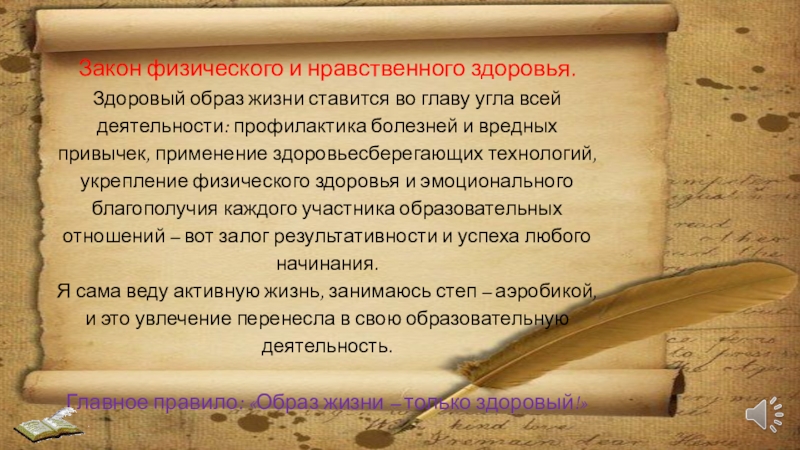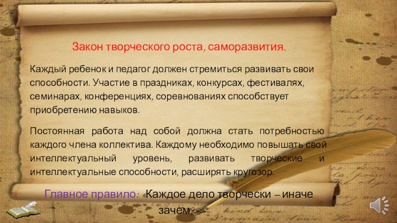 Живёт лишь тот, кто творит и двигается вперед. Научить детей творить, создавать, двигаться вперед, глубже окунуться в Мир – задача достойная педагога. Как и любая жизнь, моя жизнь строится по законам.