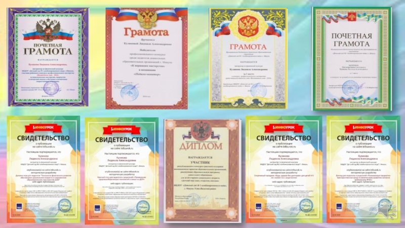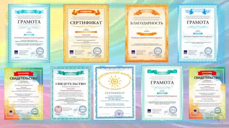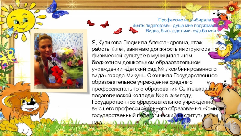 Я, Куликова Людмила Александровна, стаж работы 9 лет, занимаю должность инструктора по физической культуре в муниципальном бюджетном дошкольном образовательном учреждении «Детский сад № 1 комбинированного вида» города Микунь. Окончила Государственное образовательное учреждение среднего профессионального образования Сыктывкарский педагогической колледж №2 в 2006 году, Государственное образовательное учреждение высшего профессионального образования «Коми государственный педагогический институт» в 2009 году .