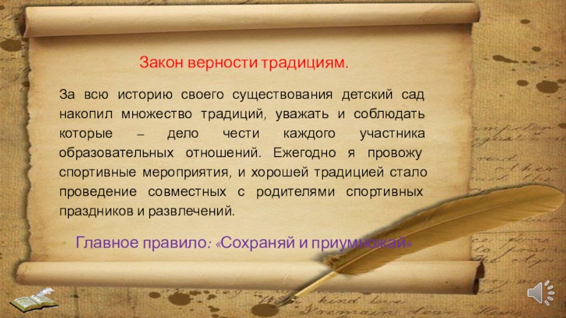традиций, уважать и соблюдать которые – дело чести каждого участника образовательных отношений. Ежегодно я провожу спортивные мероприятия, и хорошей традицией стало проведение совместных с родителями спортивных праздников и развлечений.