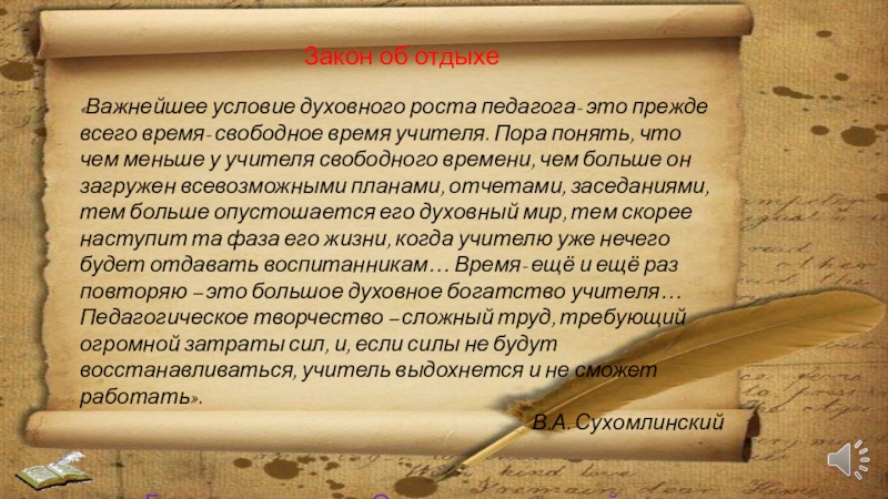 свободное время учителя. Пора понять, что чем меньше у учителя свободного времени, чем больше он загружен всевозможными планами, отчетами, заседаниями, тем больше опустошается его духовный мир, тем скорее наступит та фаза его жизни, когда учителю уже нечего будет отдавать воспитанникам… Время- ещё и ещё раз повторяю – это большое духовное богатство учителя… Педагогическое творчество – сложный труд, требующий огромной затраты сил, и, если силы не будут восстанавливаться, учитель выдохнется и не сможет работать».