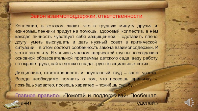 и единомышленники придут на помощь, здоровый коллектив: в нём каждая личность чувствует себя защищённой. Подставить плечо другу, уметь выслушать и дать нужный совет в критической ситуации – в этом состоит особенность закона взаимоподдержки. И я этот закон чту. Я являюсь членом творческой группы по созданию основной образовательной программы детского сада, веду работу по охране труда, сайта детского сада, групп в социальных сетях.