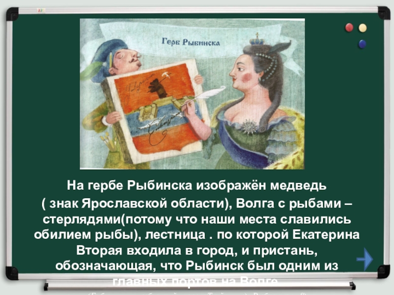 – стерлядями(потому что наши места славились обилием рыбы), лестница . по которой Екатерина Вторая входила в город, и пристань, обозначающая, что Рыбинск был одним из главных портов на Волге.