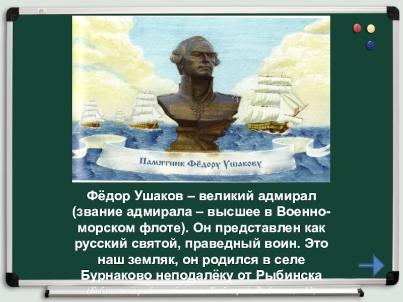 флоте). Он представлен как русский святой, праведный воин. Это наш земляк, он родился в селе Бурнаково неподалёку от Рыбинска