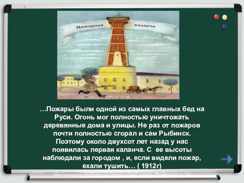 полностью уничтожать деревянные дома и улицы. Не раз от пожаров почти полностью сгорал и сам Рыбинск. Поэтому около двухсот лет назад у нас появилась первая каланча. С ее высоты наблюдали за городом , и, если видели пожар, ехали тушить… ( 1912г)