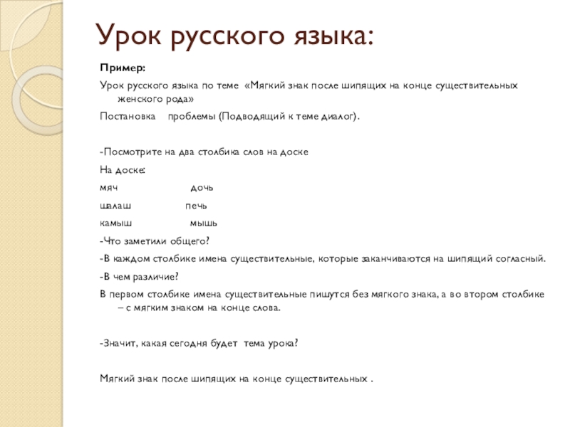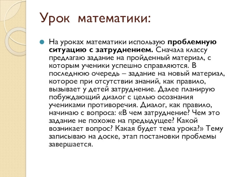 на пройденный материал, с которым ученики успешно справляются. В последнюю очередь – задание на новый материал, которое при отсутствии знаний, как правило, вызывает у детей затруднение. Далее планирую побуждающий диалог с целью осознания учениками противоречия. Диалог, как правило, начинаю с вопроса: «В чем затруднение? Чем это задание не похоже на предыдущее? Какой возникает вопрос? Какая будет тема урока?» Тему записываю на доске, этап постановки проблемы завершается.