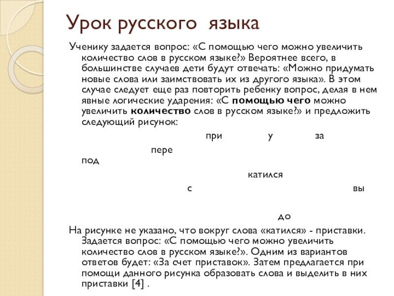На рисунке не указано, что вокруг слова «катился» - приставки. Задается вопрос: «С помощью чего можно увеличить количество слов в русском языке?». Одним из вариантов ответов будет: «За счет приставок». Затем предлагается при помощи данного рисунка образовать слова и выделить в них приставки [4] .