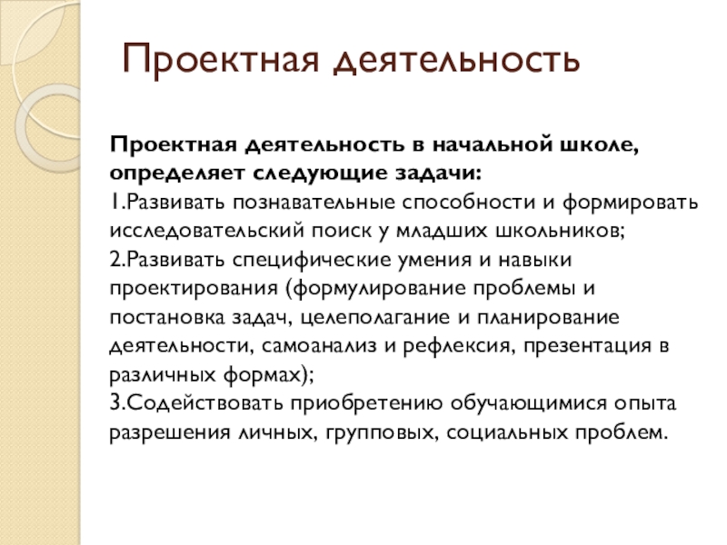 Проектная деятельность в начальной школе, определяет следующие задачи: