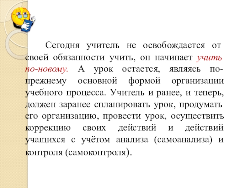учить по-новому. А урок остается, являясь по-прежнему основной формой организации учебного процесса. Учитель и ранее, и теперь, должен заранее спланировать урок, продумать его организацию, провести урок, осуществить коррекцию своих действий и действий учащихся с учётом анализа (самоанализа) и контроля (самоконтроля).